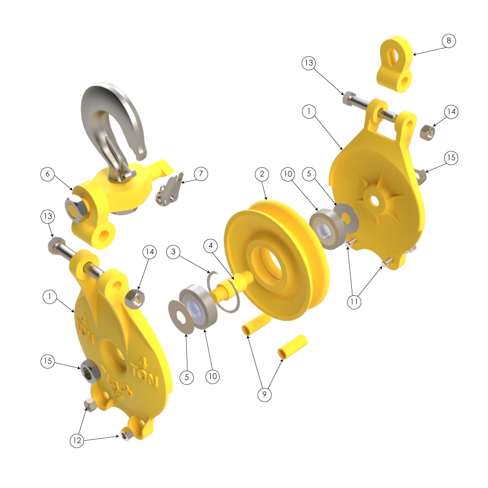 Item # TLB-6H TLB-8H Description Part # Qty Part # Qty 1 502-01 2 505-01 2 Side Frame Machined 2 502-02 1 505-02 1 Sheave Wheel Machined 3 502-03 1 505-03 1 Retaining Ring 4 502-04 1 505-04 1 Standard Shaft 5 502-05 1 505-05 2 Bearing Spacer 6 502-07 1 505-07 1 Swivel Hook Assembly 7 502-20 1 505-19 1 Latch Kit 8 502-22 1 505-08 1 Clevis Hook Link 9 502-25 2 505-25 2 Spacer 10 720-01 2 720-02 2 Bearing 11 0640BHHG5 2 0848BHHZG5 2 Spacer Bolt 12 06NH 2 08NHGR5 2 Spacer Nut 13 1240BHHZG5 2 1064BHHZGR5 2 Hook Link Bolt 14 12NH 2 10NH 2 Hook Link Nut 15 14NJNFG5 2 14NJNFG5 2 Shaft Nut